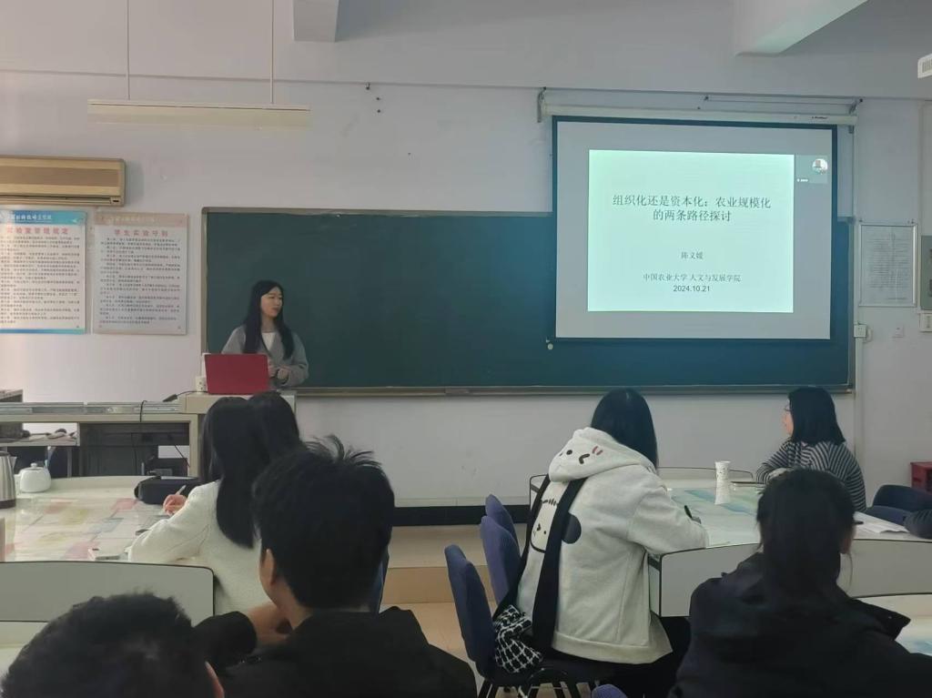 2024年10月21日,財經(jīng)學院邀請中國農(nóng)業(yè)大學人文與發(fā)展學院的陳義媛教授,作了題為“組織化還是資本化:農(nóng)業(yè)規(guī)模化的兩條路徑探討”的專題講座。講座由財經(jīng)學院院長閆文教授主持,財經(jīng)學院研究生導師、30余名研究生線下聽取了此次講座,另外還有150多名本科生線上聆聽了講座。