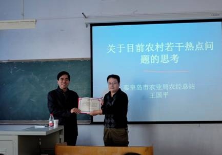 報告會上,王國平研究員就土地制度改革、農村集體經濟組織構建、農民專業(yè)合作社、家庭農場等當前我國農村改革與發(fā)展的熱點問題,從國家政策、工作實際及本人思考等不同角度進行了詳細講解,并結合秦皇島農村工作的實際提出了值得研究的一系列具體問題。報告會對于師生更加深入的了解農村改革現(xiàn)狀,開展相關問題的研究起到了較好的促進作用。報告會前,財經學院院長賈圣武代表學院向王國平研究員頒發(fā)了我校農業(yè)推廣碩士(農村與區(qū)域發(fā)展領域)碩士研究生校外指導教師聘書。