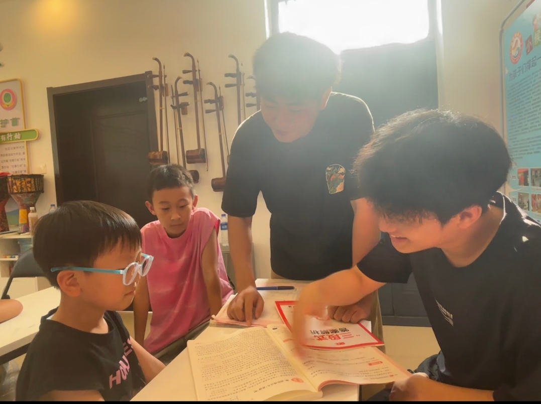 經(jīng)過兩天的趣味課程預(yù)熱,實(shí)踐團(tuán)隊(duì)于第三天、第四天轉(zhuǎn)入“課后作業(yè)輔導(dǎo)”環(huán)節(jié)。針對不同年級學(xué)生的學(xué)業(yè)需求,輔導(dǎo)員們分組開展輔導(dǎo),重點(diǎn)幫助孩子們梳理數(shù)學(xué)公式、講解語文閱讀技巧、鞏固英語單詞記憶。遇到復(fù)雜題目時,大學(xué)生們用“思維導(dǎo)圖”“情景代入”等方法拆解難點(diǎn),引導(dǎo)孩子們主動思考;對于基礎(chǔ)薄弱的學(xué)生,更是一對一耐心講解,鼓勵他們大膽提問。“大哥哥教我用畫圖法解應(yīng)用題,比課本上的方法更簡單!”五年級學(xué)生小宇說。輔導(dǎo)過程中,輔導(dǎo)員們還注重培養(yǎng)孩子們的學(xué)習(xí)習(xí)慣,提醒他們整理錯題、規(guī)劃時間,讓暑期學(xué)業(yè)復(fù)習(xí)更高效。