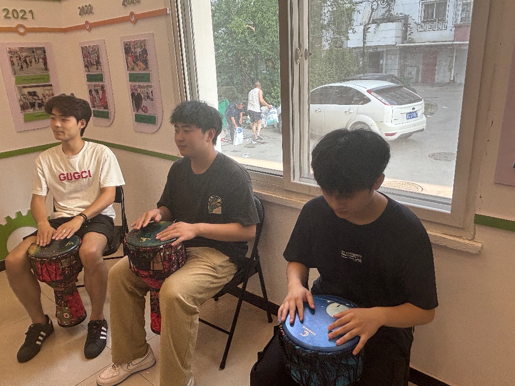 實(shí)踐活動第五天,充滿活力的“非洲鼓教學(xué)”成為收尾亮點(diǎn)。大學(xué)生輔導(dǎo)員們帶著色彩鮮明的非洲鼓來到課堂,先通過一段熱情的鼓樂表演點(diǎn)燃?xì)夥眨S后從鼓面分區(qū)、基本節(jié)奏型教起,用“咚——噠啦——”的口訣幫助孩子們掌握節(jié)拍。課堂上,孩子們跟著輔導(dǎo)員的示范拍打鼓面,從零散的節(jié)奏到整齊的合奏,歡聲笑語與鼓點(diǎn)聲交織成歡樂的樂章。“非洲鼓不用認(rèn)譜也能玩,太有趣了!”孩子們在分組合奏中體驗(yàn)著協(xié)作的快樂,也感受著多元文化的魅力。